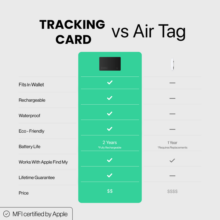 If you're anything like us, you've probably lost something important during a really epic adventure. that's why we created Tracking Card. Simply open Apple's Find My app, track your wallet, and get going.